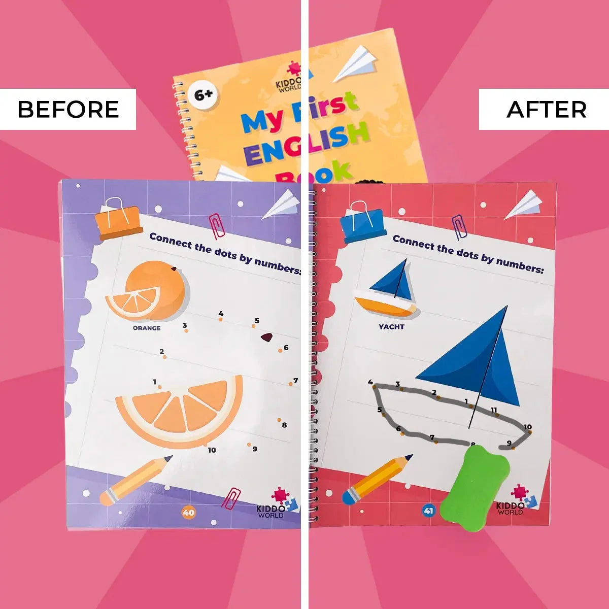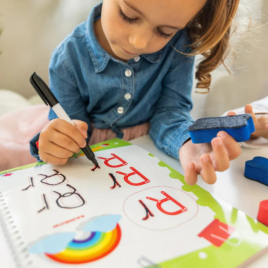 Explore the English alphabet, writing, and simple games in one Montessori workbook. First English workbook offers a perfect introduction of the English language through engaging tasks of mazes, connecting dots with numbers, matching letters with pictures and other fun games.